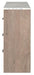 Cool, clean and casually modern. This dresser and mirror's light natural finish and faux Calcutta marble top set the tone for your calming sanctuary. Large linear pulls add dimension and authenticity. Six smooth-gliding drawers neatly accommodate your wardrobe needs.