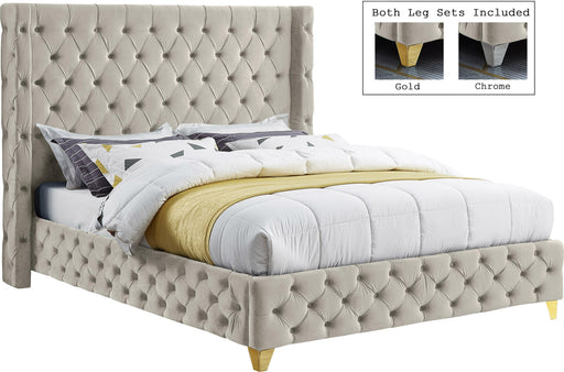 MeridianSavan Cream Velvet Full Bed - Rich Cream Velvet - Deep Button Tufting - Gold and Chrome Legs Included with Each Bed - Full Slats (No Box Spring...